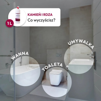 Odpowiednie połączenie składników zapewnia skuteczne mycie urządzeń sanitarnych, ale także pomoc w neutralizacji nieprzyjemnych zapachów. Z jego pomocą w kilka chwil usuniesz wapno, kamień i rdzę.