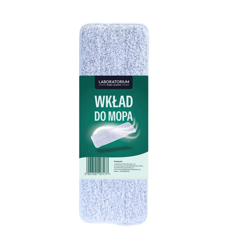 Wkład z mikrofibry do mopa Laboratorium Pani Domu – miękki, chłonny i wszechstronny. Doskonały do mycia na mokro i czyszczenia na sucho — skutecznie zbiera kurz, brud i wilgoć z różnych powierzchni.