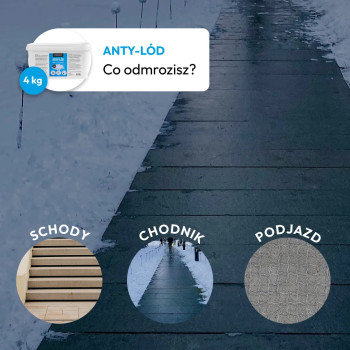 D-LUX Anty-Lód usuwa zmarznięty śnieg i lód z różnego rodzaju nawierzchni, chodników, podjazdów. Środek działa poprzez wytwarzanie ciepła. Usuwa śnieg i lód zaledwie w kilka minut przy temperaturach sięgających nawet do -30°C (sól jest skuteczna w temperaturze tylko do -7°C), zabezpieczając jednocześnie na wiele godzin nawierzchnię przed ponownym oblodzeniem.