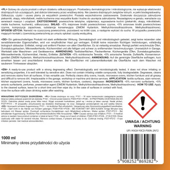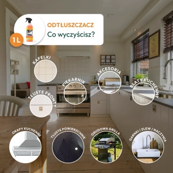 - Doskonale sprawdzi się czyszcząc piekarniki, wybitnie odtłuszcza okapy, mikrofalówki, płyty grzewcze, kuchenki gazowe, zlewy, meble kuchenne oraz kafelki.