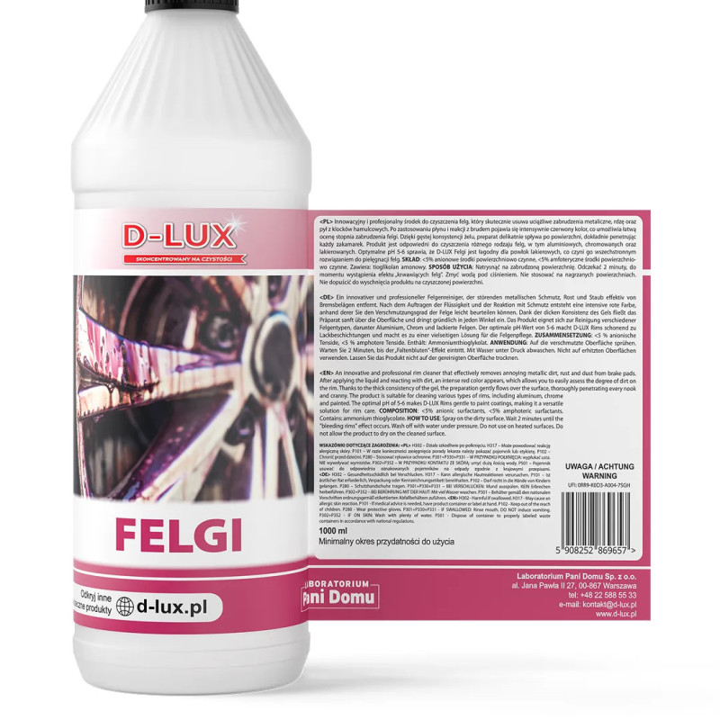 D-LUX do czyszczenia felg samochodowych to innowacyjny i profesjonalny środek, który skutecznie usuwa zanieczyszczenia metaliczne. Preparat przeznaczony jest do czyszczenia felg stalowych, aluminiowych, chromowanych lub lakierowanych, z których skutecznie usuwa wszystkie zanieczyszczenia drogowe. Dzięki specjalnej formule produktu efekt “krwawej felgi” staje się wyraźny, co pozwala szybko i sprawnie ocenić poziom zabrudzenia felgi. Płyn, po kontakcie z zabrudzeniami zabarwia się na czerwono, co pozwala na ocenę stanu felg oraz aktywne działanie przeciw brudowi.