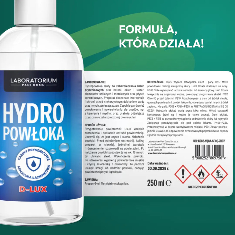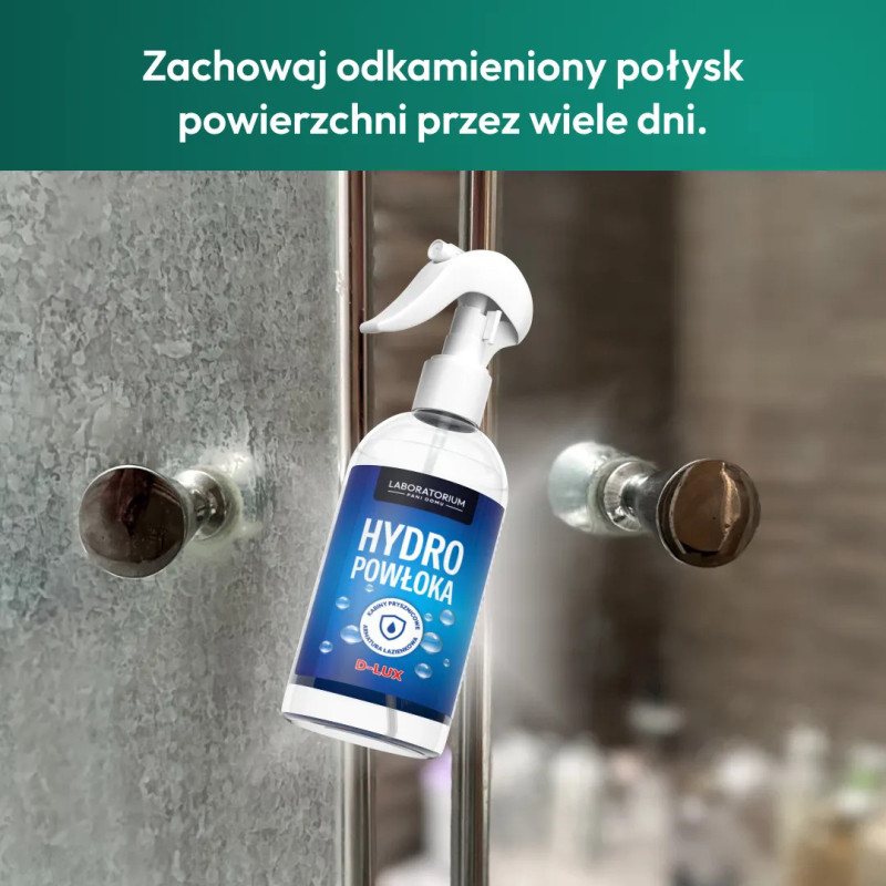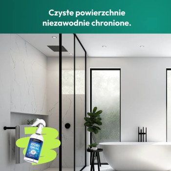 Powłoka hydrofobowa tworzy na zabezpieczanej powierzchni warstwę, która działa jak niewidzialna wycieraczka. Doskonale impregnuje i zapobiega powstawaniu i nawarstwianiu się osadów, np. z kamienia i mydlin, oraz ułatwia późniejsze czyszczenie zabezpieczonej powierzchni. Dzięki nanotechnologii pozostawia warstwę antystatyczną, która ogranicza rozwój bakterii, grzybów i roztoczy, nie pozostawia smug i zacieków i odpycha cząsteczki wody gwarantując nienaganny wygląd czyszczonej powierzchni na długo!