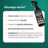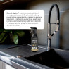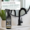 Skuteczny płyn do czyszczenia czarnej i złotej armatury oraz czarnych zlewów. Usuwa osady z kamienia i mydła, nadaje delikatny połysk, nie pozostawia smug i zacieków, a dzięki filmowi ochronnemu ogranicza ponowne osadzanie się brudu.