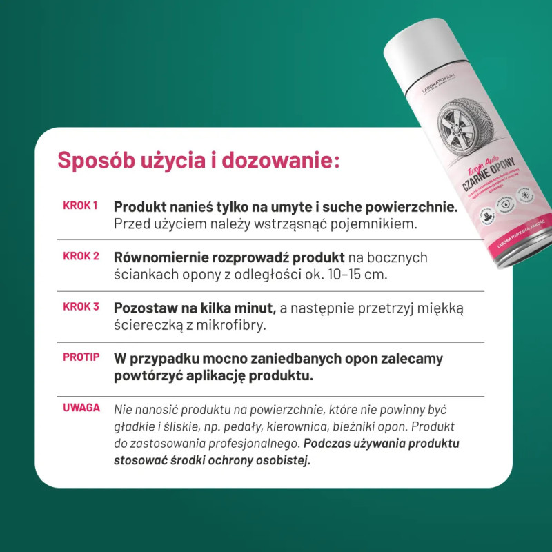 Przed użyciem wstrząsnąć pojemnikiem. Rozpylić równomiernie na boczne ścianki opony z odległości ok. 10–15 cm. Pozostawić na kilka minut, następnie przetrzeć miękką ściereczką z mikrofibry. W przypadku mocno zaniedbanych opon zaleca się powtórzyć aplikację.
