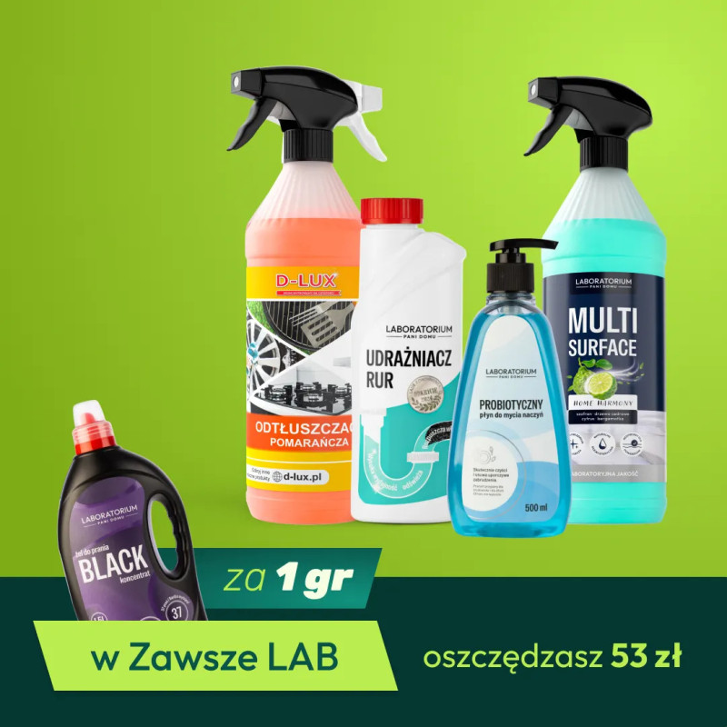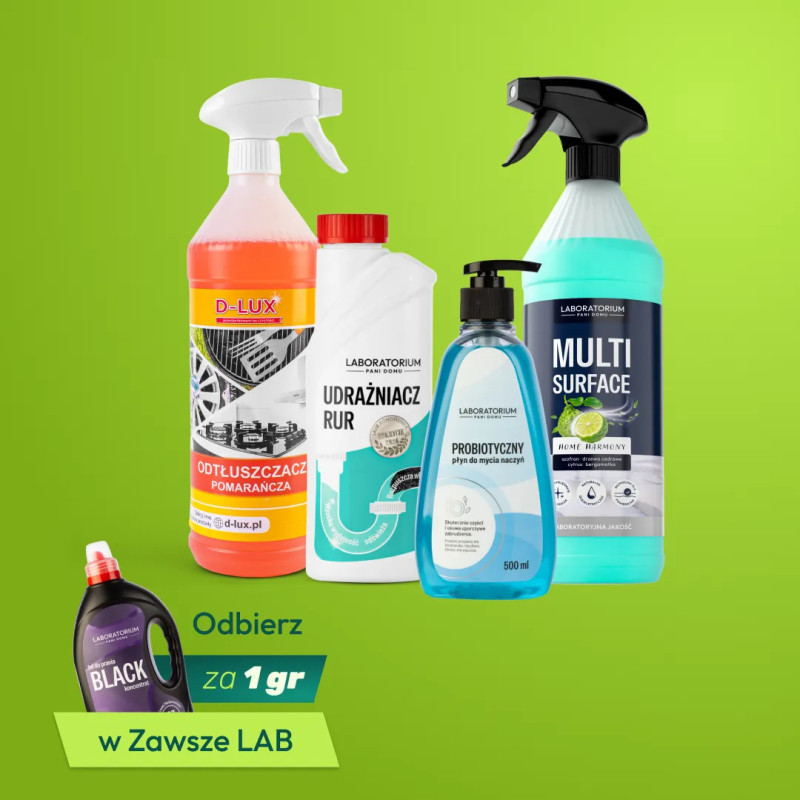 Cena zestawu jest obniżona dzięki 50% rabatowi na Multi Surface Home Harmony - nowość w naszej ofercie, a dodatkowo — po spełnieniu warunków — możesz dobrać żel do prania Black za 1 grosz w ramach programu Zawsze LAB.