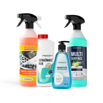 Zestaw składa się z czterech skutecznych produktów do sprzątania domu, szczególnie w okresie świątecznym, kiedy kuchnia i jadalnia wymagają ciągłego czyszczenia.