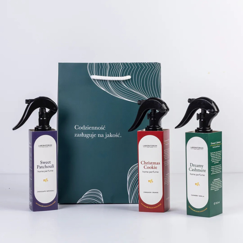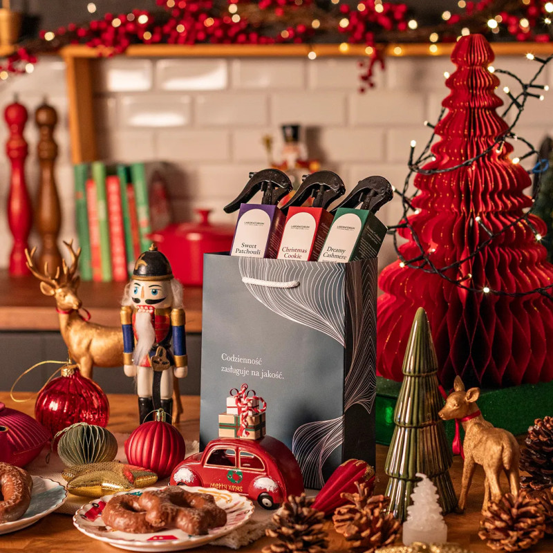 Stwórz magiczną, aromatyczną atmosferę w domu dzięki naszemu zestawowi trzech luksusowych olejków zapachowych: Christmas Cookie, Dreamy Cashmere i Sweet Patchouli. Każdy z nich neutralizuje nieprzyjemne zapachy, działa dezynfekująco i utrzymuje się przez 1–2 dni. Całość zapakowana w elegancką torbę prezentową – gotowy upominek, który zachwyci bliskich.