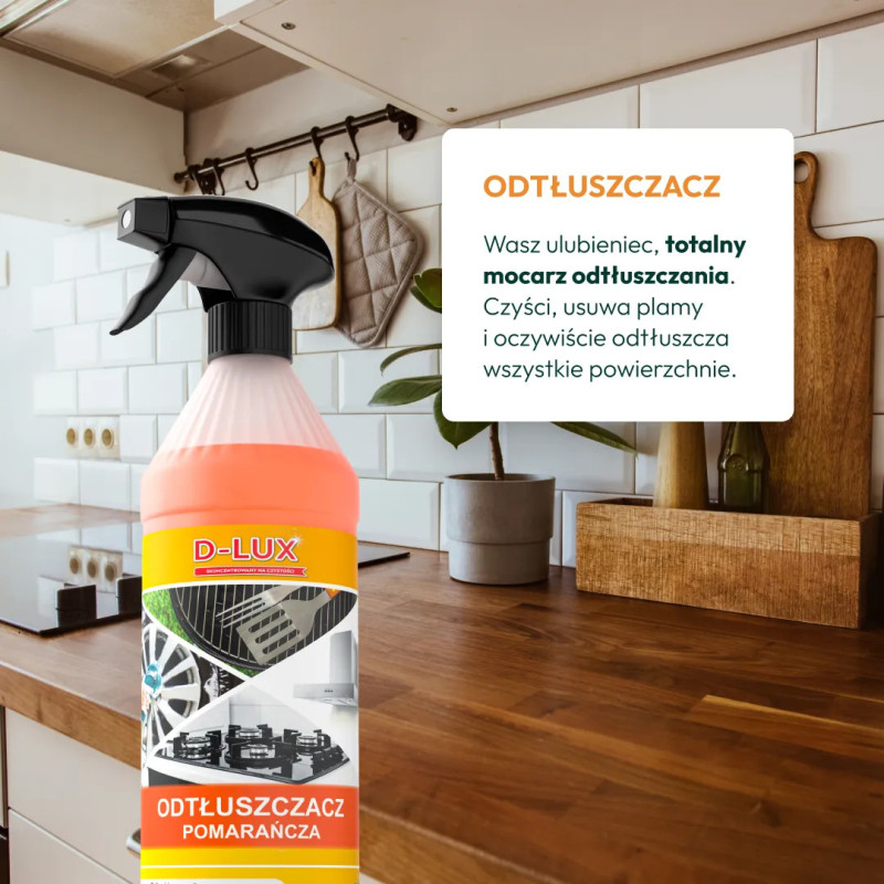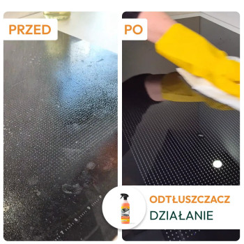 Gotowy do użycia produkt o silnym działaniu odtłuszczającym. Odtłuszcza, czyści i usuwa plamy ze wszystkich powierzchni. Doskonale doczyszcza zabrudzone piekarniki, okapy, mikrofalówki, płyty grzewcze, kuchenki gazowe, zlewy, meble kuchenne, kafelki/płytki w kuchni oraz wszystkie tłuste i trudne do usunięcia zabrudzenia. Skuteczny na tłuste plamy na ubraniach! Niezastąpiony w garażu, warsztacie czy serwisach maszyn i urządzeń. Przebadany dermatologicznie i mikrobiologicznie, nie wykazuje właściwości drażniących lub uczulających, jest dobrze tolerowany przez wrażliwą skórę. Nie zawiera drażniących związków lotnych, w pełni biodegradowalny