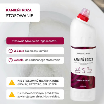 Proponowany płyn jest niezwykle silnym środkiem, charakteryzującym się krótkim czasem reakcji. Może być również stosowany do odkamieniania i odrdzewiania starych urządzeń sanitarnych, z silnymi zanieczyszczeniami.