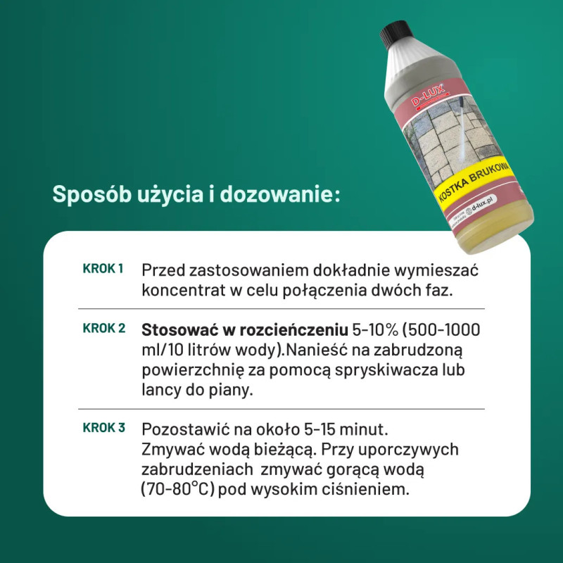 Co wyróżnia nasz produkt spośród innych to jego skoncentrowana formuła dwufazowa. Dzięki temu preparat jest wydajny i zapewnia doskonałe rezultaty czyszczenia. Wystarczy go wstrząsnąć i odpowiednio rozcieńczyć z wodą, a następnie zastosować na powierzchnię kostki brukowej. W efekcie z łatwością usuniesz uporczywe zabrudzenia i przywrócisz kostce jej pierwotny blask.