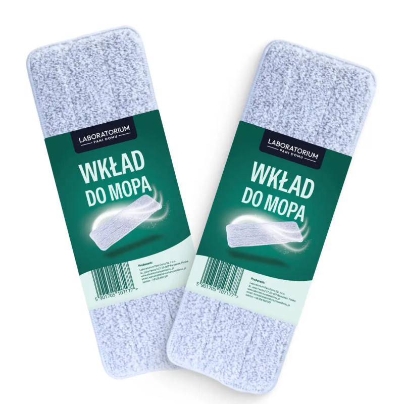 Zestaw 2 wkładów z mikrofibry do mopa Laboratorium Pani Domu – miękki, chłonny i wszechstronny. Doskonały do mycia na mokro i czyszczenia na sucho — skutecznie zbiera kurz, brud i wilgoć z różnych powierzchni.