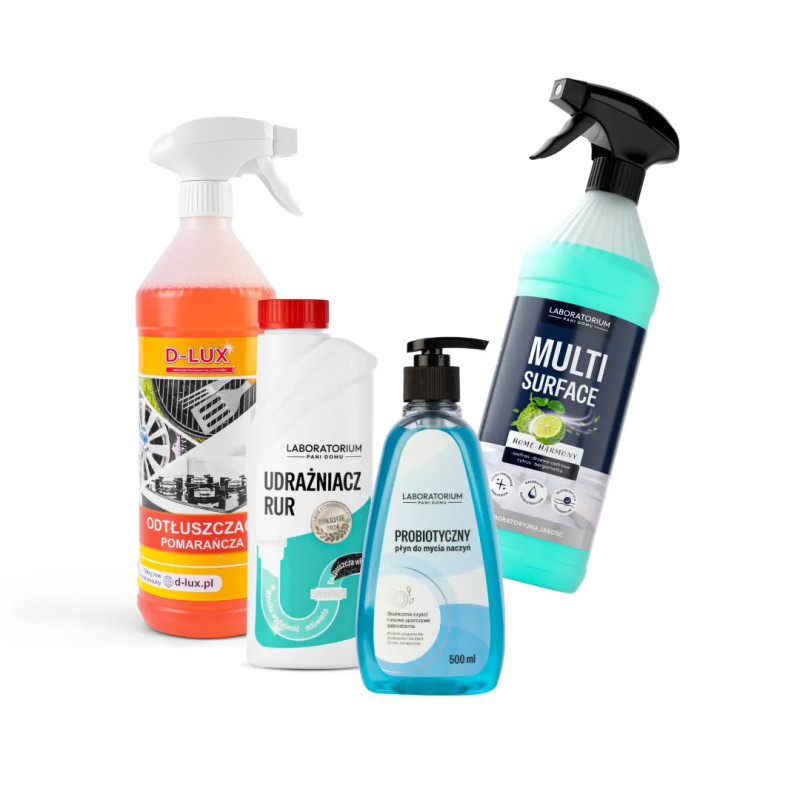 Zestaw łączy wszechstronny środek czyszczący o świeżym, eleganckim zapachu bergamotki i cedru, skuteczny odtłuszczacz pomarańczowy, profesjonalny udrażniacz do rur oraz naturalny, probiotyczny płyn do mycia naczyń, który dba o skórę dłoni i higienę kuchni. To kompleksowa czystość, świeżość i oszczędność w jednym zestawie – sprzątanie po świętach jeszcze nigdy nie było tak proste i przyjemne.