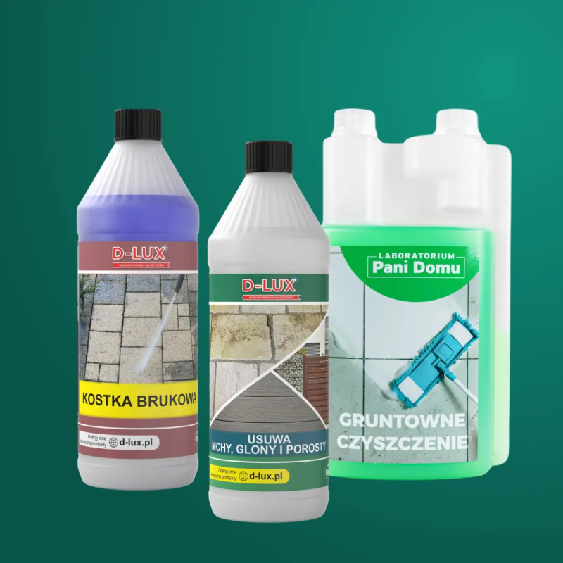 Zestaw zawiera trzy skuteczne preparaty, które pozwolą kompleksowo zadbać o czystość nawierzchni i powierzchni wokół domu.
